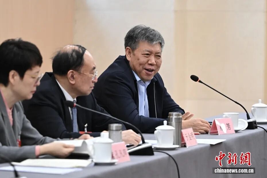 3月10日,全国政协十四届四次会议对外友好界别小组会议在北京举行。图为全国政协常委、外事委员会副主任刘结一(左一)在小组会上发言。中新社记者 佟郁 摄