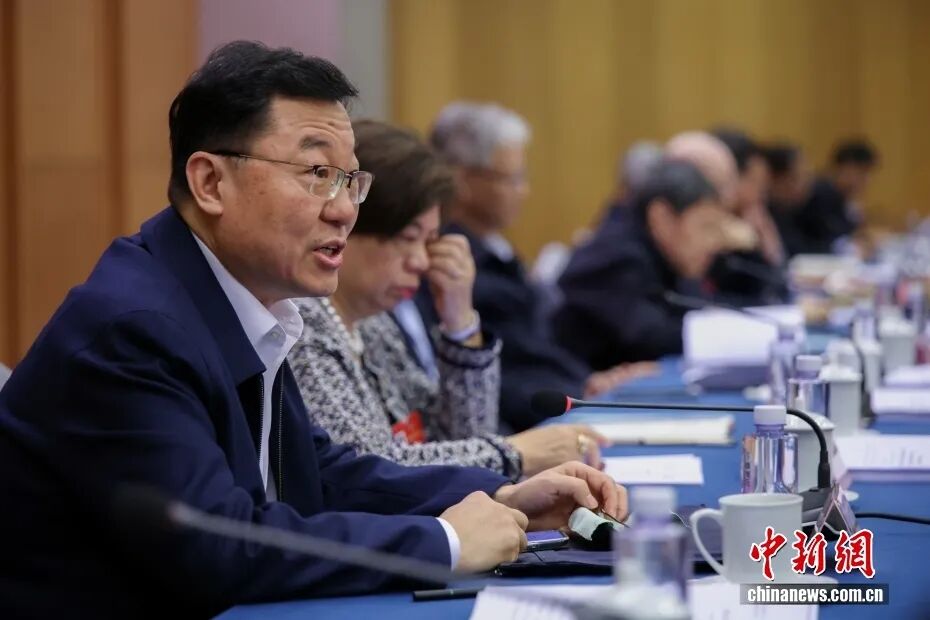 3月10日,全国政协十四届四次会议对外友好界别小组会议在北京举行。图为全国政协常委、外事委员会副主任刘结一(左一)在小组会上发言。中新社记者 佟郁 摄