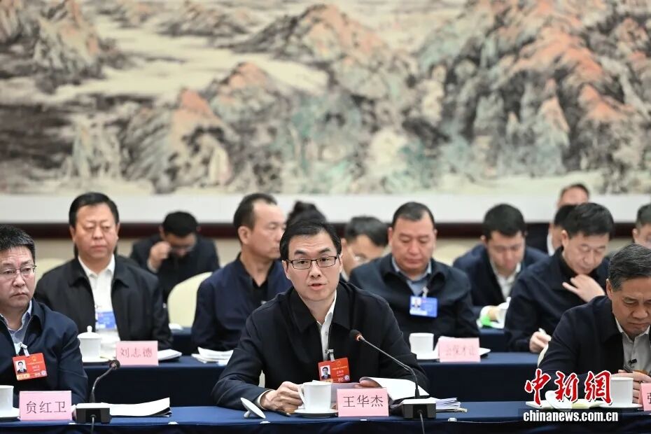 3月10日,十四届全国人大四次会议青海代表团在北京举行小组会议。图为全国人大代表、青海省海东市市长王华杰(中)发言。中新社记者 赵文宇 摄